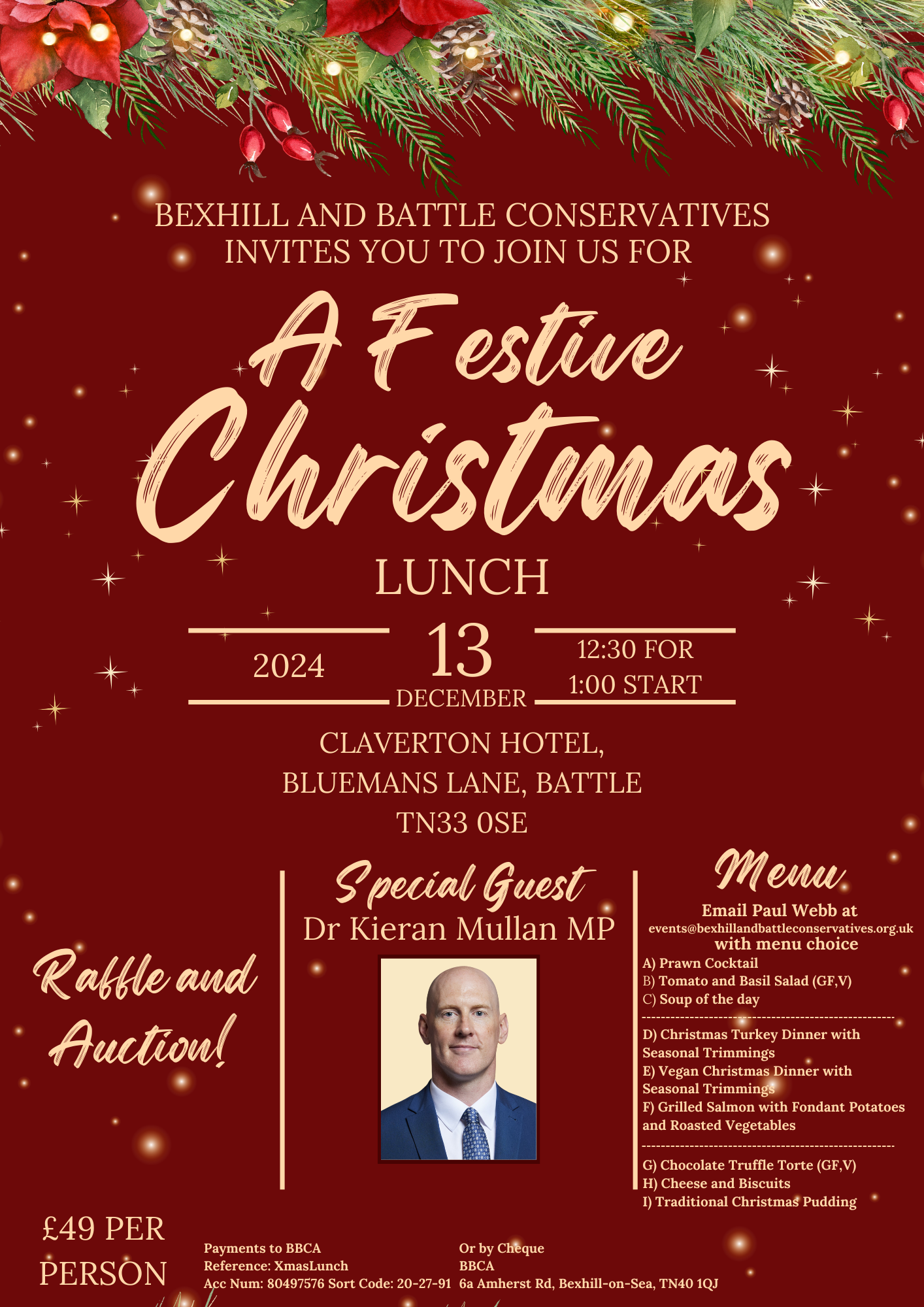 Our ever popular Christmas lunch. To book send your menu choices to Paul Webb at [email protected], for each giving your menu selections as letters. For example: