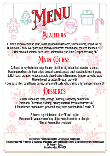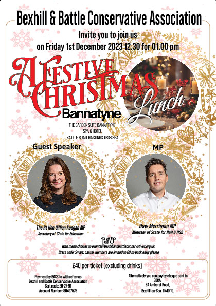 Please join us at The Garden Suite, Bannantyes Spa and Hotel on Battle Road, Hastings TN38 8EA. Our guest speaker is The Rt Hon Gillian Keegan MP, Secretary of State for Education. Our MP Huw Merriamn, Minister of State for Rail and HS2 will also be there. Please open the files below to see full details of this event, including menu choices. If you wish to book please RSVP to [email protected], with your choices and BACs payments to BBCA (Reference Xmas), Sort Code 20-27-91 Account 80497576