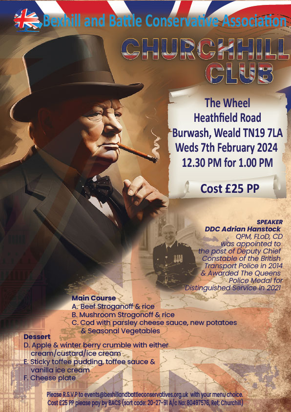 Churchill Club lunch is to be held at The Wheel Inn, Burwash at 12.30pm for 1pm - two course lunch £25
