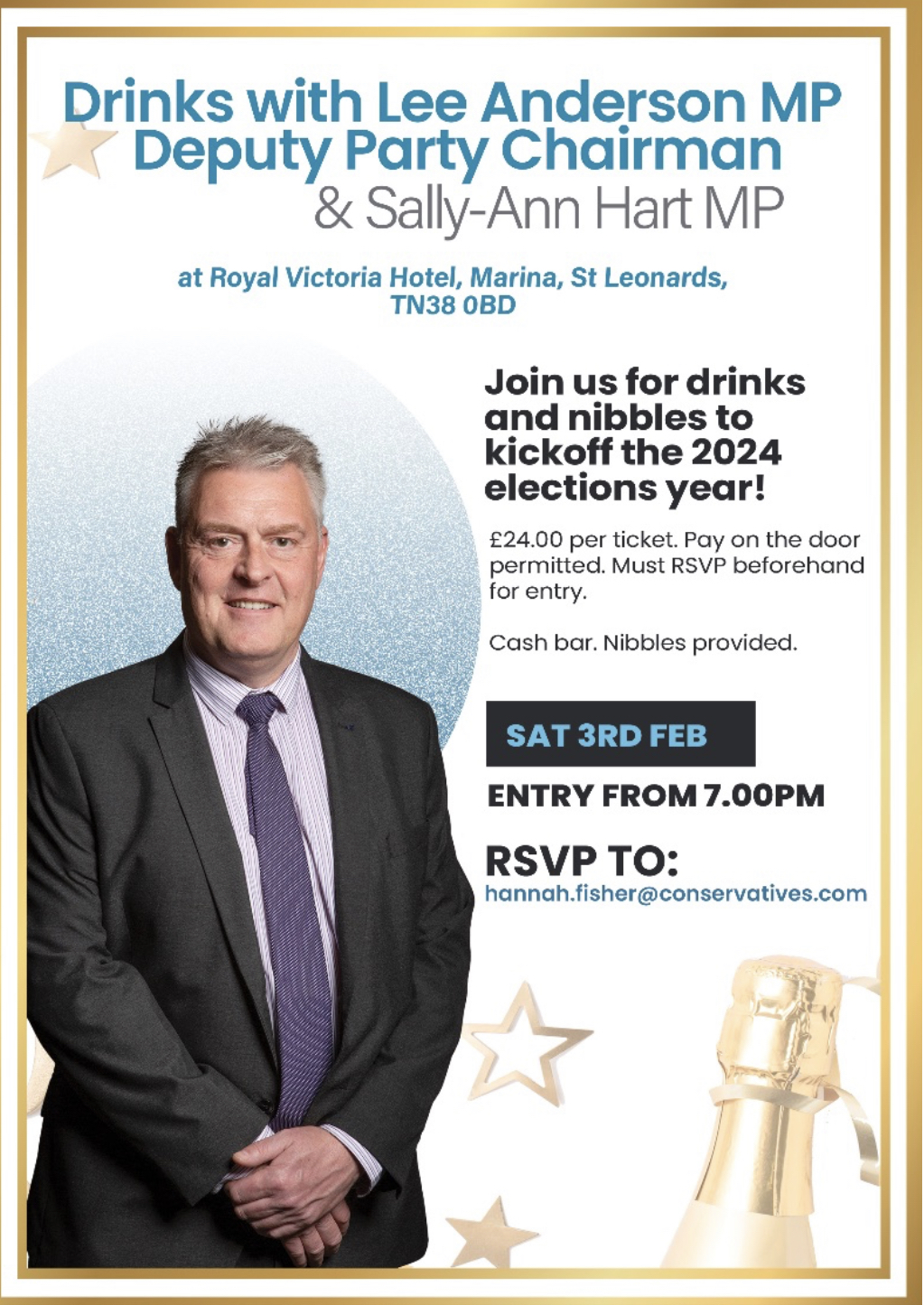 You are invited to join Lee Anderson, MP & Sally-Ann Hart MP at the Royal Victoria Hotel, Marina, St Leonards, TN38 0BD for drinks and nibbles to kickoff the 2024 elections year.