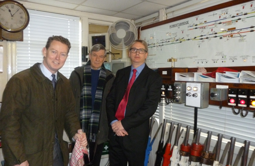 21.02.12 for immediate release: Bexhill and Battle MP, Greg Barker, visited the Network Rail signal box at Robertsbridge Station last Friday to see for himself why the crossing needs to remain closed at the station for several minutes. Greg was joined by his constituent Mr Henry Macdonald who had contacted him about the lengthy wait for motorists at the level crossing. Greg observed the experienced signal operator in action whilst Network Rail staff explained that there were several factors which have an effect on the time the level crossing remains closed. The Robertsbridge signal box manually controls and monitors four level crossings, including Etchingham Station. The key priorities for the operator are public safety and to ensure the trains have a clear passage on the line to avoid delays to the service. Speaking at Robertsbridge Greg said “I am grateful to Network Rail for this fascinating insight into the work of signal operators at Robertsbridge. It is a hugely responsible role which requires the operator to be extremely vigilant to avoid possible dangers to the public and to ensure the line runs smoothly. I understand that in due course all signals and level crossings on this line will become automatic as part of a major national project by Network Rail and this will make the level crossing down times slightly shorter. However, I am assured that the signals and level crossings which are operated in the best possible way under the present system to ensure that safety remains paramount and the trains serving my constituents run on time.”