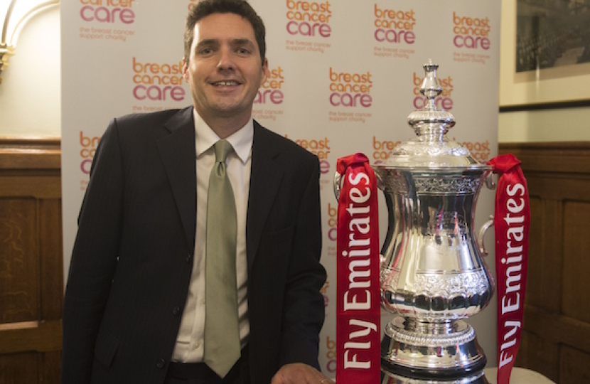 18.09.2015 for immediate release: Bexhill and Battle MP, Huw Merriman MP, posed with The Emirates FA Cup at Parliament last week to show his support for breast cancer awareness.